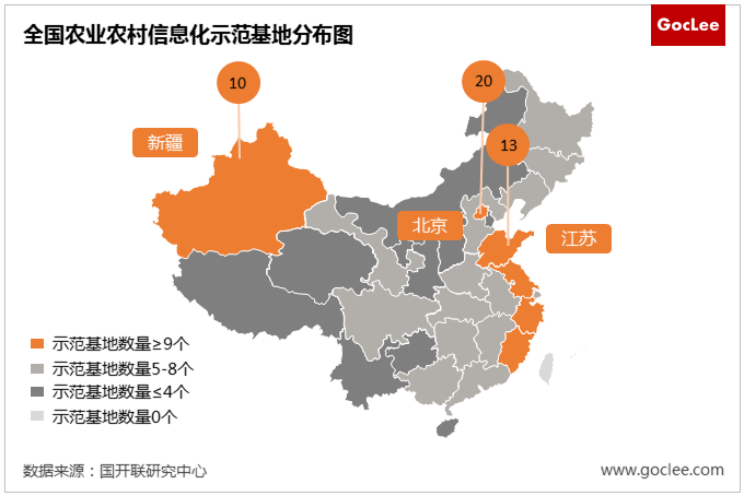 示范基地認(rèn)定于2013年首次開啟,每年認(rèn)定數(shù)量不斷增加。根據(jù)國開聯(lián)《農(nóng)業(yè)農(nóng)村信息化示范基地發(fā)展報(bào)告2021》數(shù)據(jù)顯示,2013年、2015年、2017年分別認(rèn)定4066、104個(gè)。北京憑借技術(shù)優(yōu)勢擁有最多的示范基地,新疆依托產(chǎn)業(yè)應(yīng)用優(yōu)勢擁有西部地區(qū)最多的示范基地。