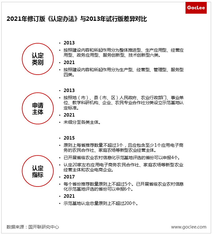 早在2013年,農(nóng)業(yè)部制定了《全國農(nóng)業(yè)農(nóng)村信息化示范基地認(rèn)定辦法(試行)》(農(nóng)市發(fā)〔20131號),對農(nóng)業(yè)農(nóng)村信息化示范基地的申報(bào)條件提出了一系列標(biāo)準(zhǔn)。根據(jù)國開聯(lián)《農(nóng)業(yè)農(nóng)村信息化示范基地發(fā)展報(bào)告2021》,2021年修訂版的認(rèn)定辦法分別在示范基地認(rèn)定類別、申請主體分類、認(rèn)定指標(biāo)三處進(jìn)行了調(diào)整。