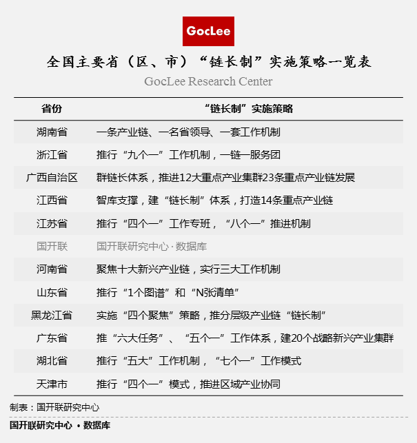 根據(jù)中國主要省份“鏈長制”實(shí)施策略報告資料顯示,廣東省、廣西自治區(qū)、湖北省、湖南省、江西省、浙江省、江蘇省、河南省、山東省和天津市均采取了省級/市級領(lǐng)導(dǎo)負(fù)責(zé)一條產(chǎn)業(yè)鏈,同時配備工作專組協(xié)助開展工作,自上而下的推動產(chǎn)業(yè)鏈的發(fā)展。
