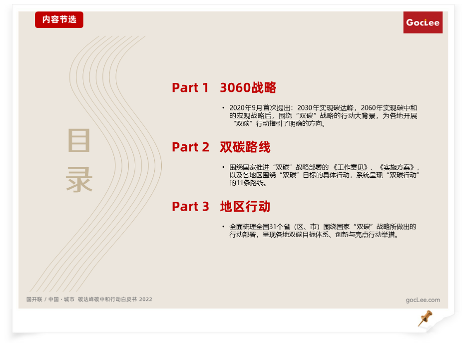 《白皮書》主要分為三部分,第一,“3060”戰(zhàn)略背景,國(guó)家提出“3060”戰(zhàn)略目標(biāo),為各地開展“雙碳”行動(dòng)指引了明確的方向;第二,雙碳路線,根據(jù)國(guó)家頂層設(shè)計(jì),系統(tǒng)梳理“雙碳行動(dòng)”的11條路線及對(duì)比不同省(區(qū)、市)的差異性做法;第三,地區(qū)行動(dòng),全面梳理31個(gè)?。▍^(qū)、市)圍繞國(guó)家“雙碳”戰(zhàn)略所做出的行動(dòng)部署,呈現(xiàn)各地雙碳目標(biāo)體系、創(chuàng)新與亮點(diǎn)行動(dòng)舉措。