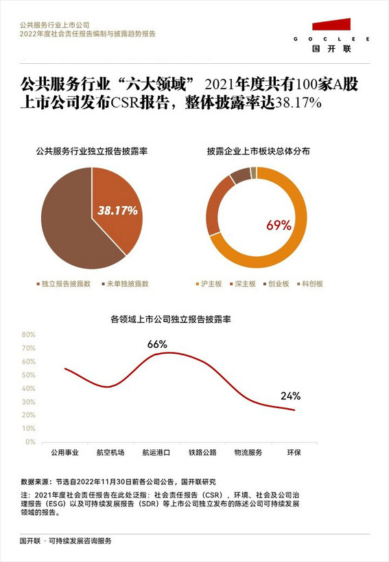 國開聯(lián)《公共服務(wù)行業(yè)2022年度社會責(zé)任報(bào)告編制與披露趨勢報(bào)告》指出,公共服務(wù)行業(yè)“六大領(lǐng)域”2021年度共有100家A股上市公司獨(dú)立發(fā)布了社會責(zé)任報(bào)告(CSR)、ESG報(bào)告和可持續(xù)發(fā)展報(bào)告(SDR),整體披露率達(dá)38.17%。