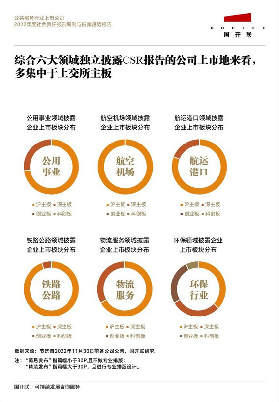 根據(jù)國開聯(lián)《公共服務(wù)行業(yè)2022年度社會責(zé)任報(bào)告編制與披露趨勢報(bào)告》數(shù)據(jù)顯示,公共服務(wù)行業(yè)六大領(lǐng)域獨(dú)立披露社會責(zé)任報(bào)告(含CSR、ESG、SDR)的公司上市地,多集中于上交所主板。