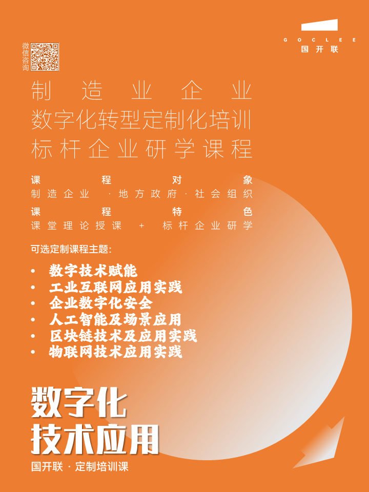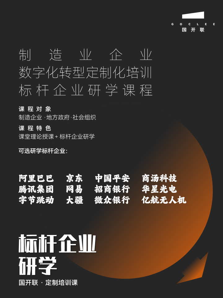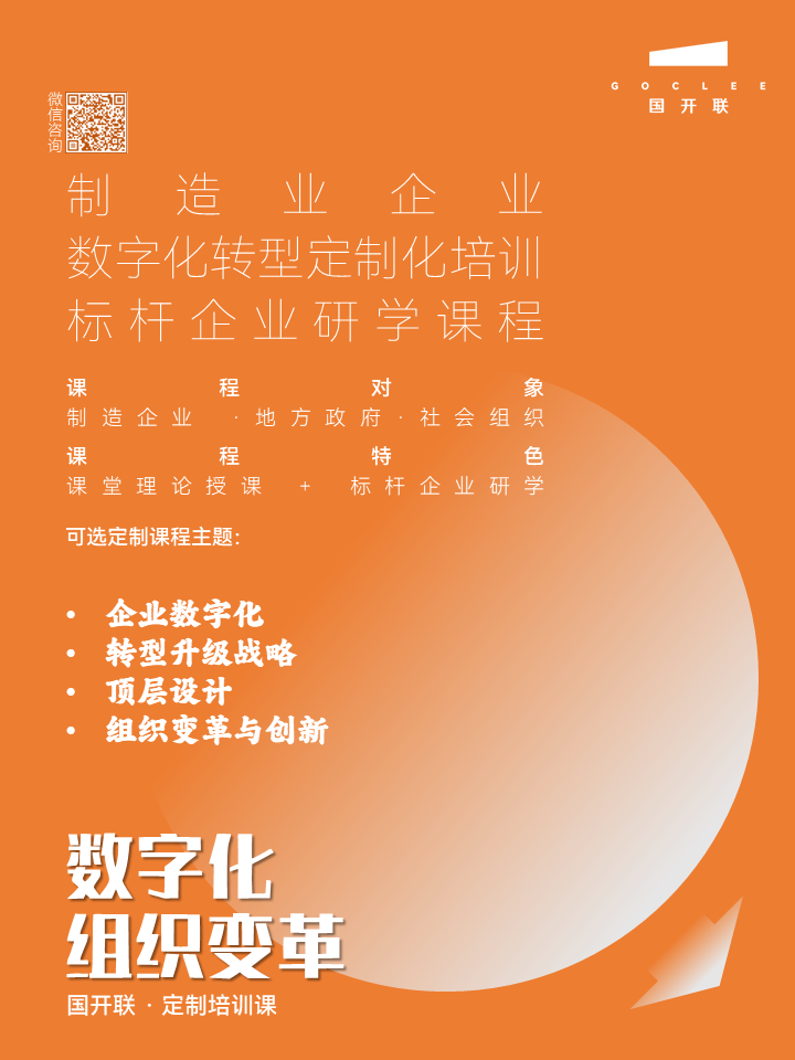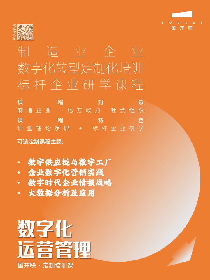 國開聯(lián)定制培訓(xùn)課負(fù)責(zé)人指出,《制造業(yè)企業(yè)數(shù)字化轉(zhuǎn)型定制化培訓(xùn)與標(biāo)桿企業(yè)研學(xué)課程》的推出,是順應(yīng)時代數(shù)字浪潮,參與數(shù)字中國建設(shè)和制造業(yè)高質(zhì)量發(fā)展而做出的市場布局,希望通過國開聯(lián)專家智庫平臺聚合的數(shù)字經(jīng)濟(jì)專家和國開聯(lián)數(shù)字經(jīng)濟(jì)深厚的研究咨詢經(jīng)驗,以定制化培訓(xùn)課程和標(biāo)桿企業(yè)研學(xué)的方式,攜手更多的制造業(yè)企業(yè)一起迎著數(shù)字時代浪潮,把握數(shù)字化轉(zhuǎn)型升級機(jī)遇。
