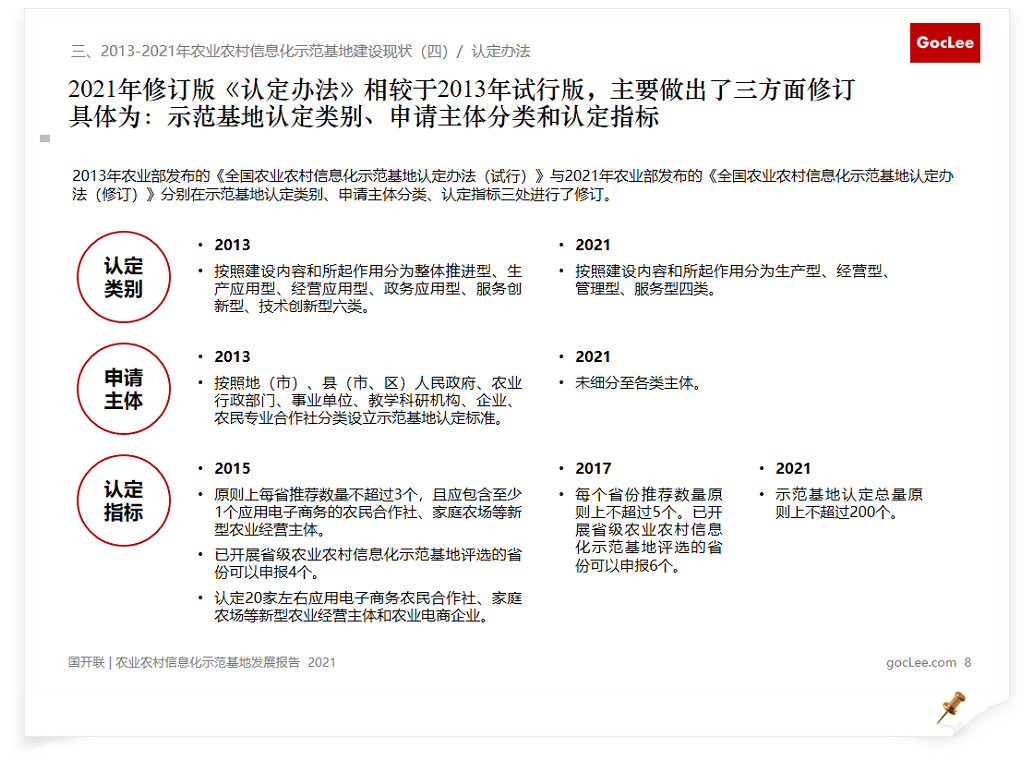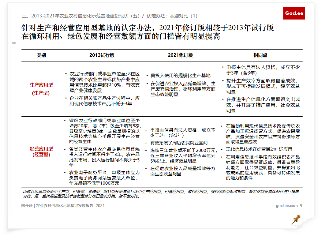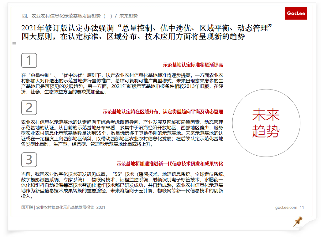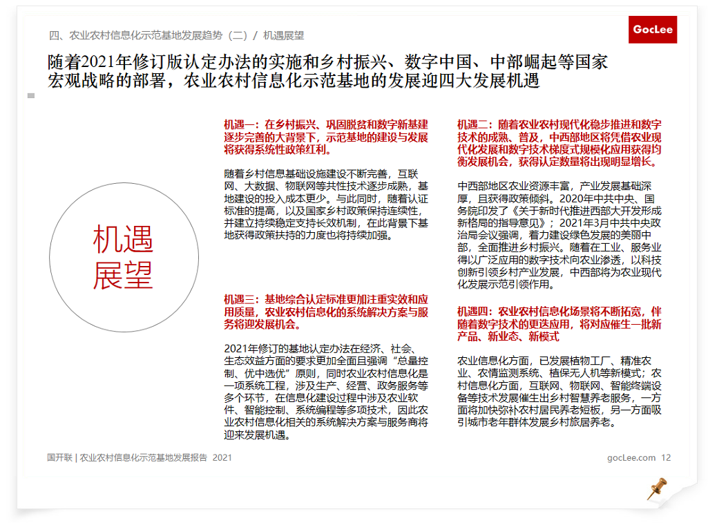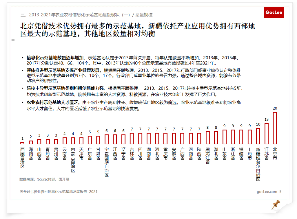 《報告》既具體呈現(xiàn)了我國歷次農(nóng)業(yè)農(nóng)村信息化示范基地認(rèn)定辦法的橫向?qū)?biāo)研究,也就我國農(nóng)業(yè)農(nóng)村信息化示范基地在各地區(qū)的建設(shè)與鈞衡發(fā)展情況通過數(shù)據(jù)進(jìn)行了可視化呈現(xiàn),更結(jié)合區(qū)域均衡發(fā)展、未來趨勢、數(shù)字技術(shù)在農(nóng)業(yè)農(nóng)村領(lǐng)域的應(yīng)用等,提出了投資與發(fā)展機(jī)遇展望。