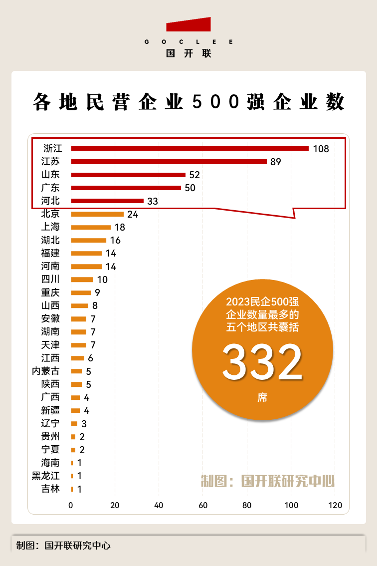 全國性產(chǎn)業(yè)規(guī)劃與招商咨詢服務(wù)機構(gòu)——國開聯(lián)研究中心統(tǒng)計數(shù)據(jù)顯示,2023民營企業(yè)500強企業(yè)分別來自全國27個省(區(qū)、市),企業(yè)數(shù)最多的10個地區(qū)分別為:浙江、江蘇、山東、廣東、河北、北京、上海、湖北、河南和福建。其中,浙江省以108家民營企業(yè)500強遙遙領(lǐng)先,前5大企業(yè)數(shù)最多的地區(qū)共囊括332席,前10大企業(yè)數(shù)量最多的地區(qū)囊括418席。