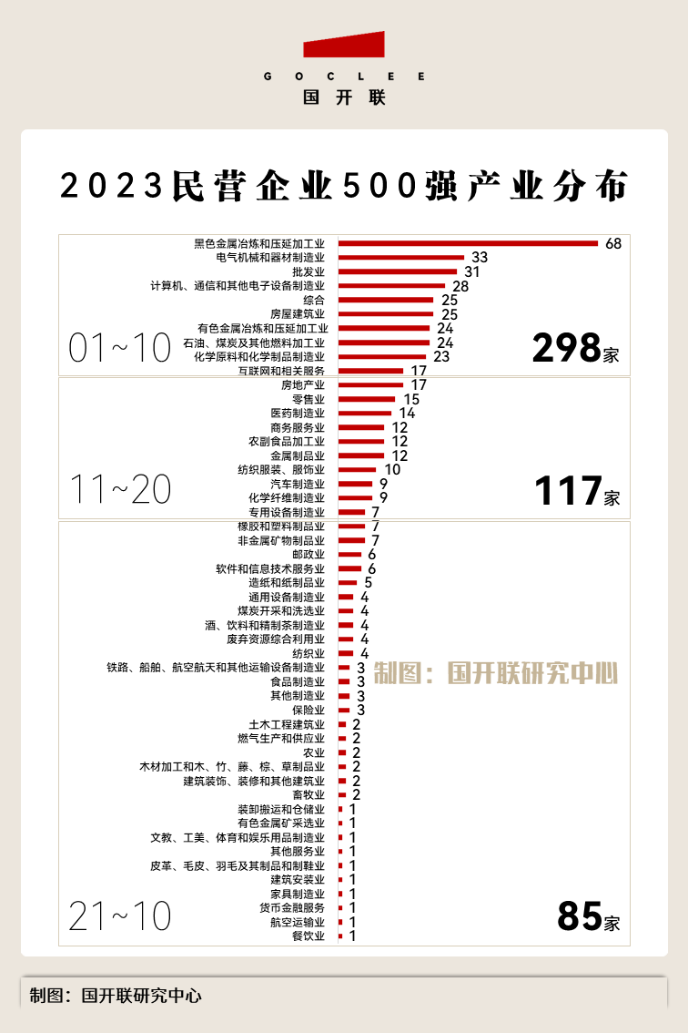 全國性產(chǎn)業(yè)規(guī)劃與招商咨詢服務(wù)機構(gòu)——國開聯(lián)研究中心統(tǒng)計數(shù)據(jù)顯示,2023民營企業(yè)500強企業(yè)分別來自50個產(chǎn)業(yè),企業(yè)最多的前10大產(chǎn)業(yè)共占298席,而“黑色金屬冶煉和壓延加工業(yè)、電氣機械和器材制造業(yè)、批發(fā)業(yè)、計算機、通信和其他電子設(shè)備制造業(yè)及綜合”是擁有企業(yè)數(shù)最多的五大產(chǎn)業(yè)。