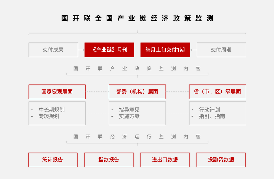 國開聯(lián)“產(chǎn)業(yè)鏈經(jīng)濟(jì)政策監(jiān)測”服務(wù)重點(diǎn)由兩部分構(gòu)成,一是標(biāo)準(zhǔn)化服務(wù),即“全國產(chǎn)業(yè)鏈經(jīng)濟(jì)政策監(jiān)測月刊”;二是定制化服務(wù),即分地區(qū)、分領(lǐng)域、分機(jī)構(gòu)的專項(xiàng)政策監(jiān)測服務(wù)。