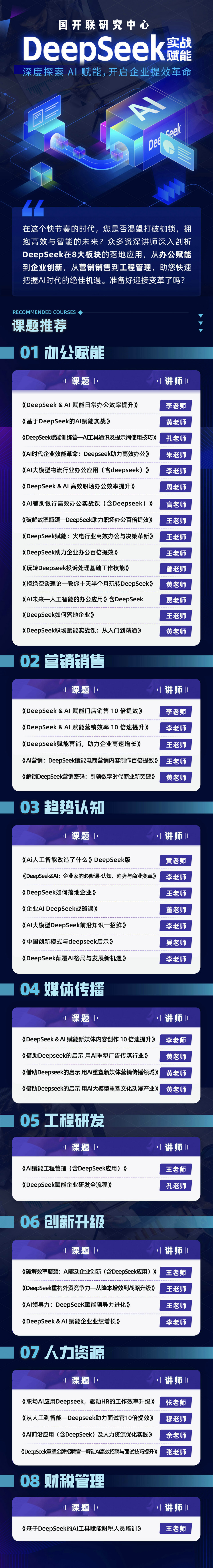 日前,國開聯(lián)研究中心定制培訓(xùn)課業(yè)務(wù)部門發(fā)布《DeepSeek系列培訓(xùn)課程(線下內(nèi)訓(xùn)課)》,涉8大領(lǐng)域、42個(gè)主題。