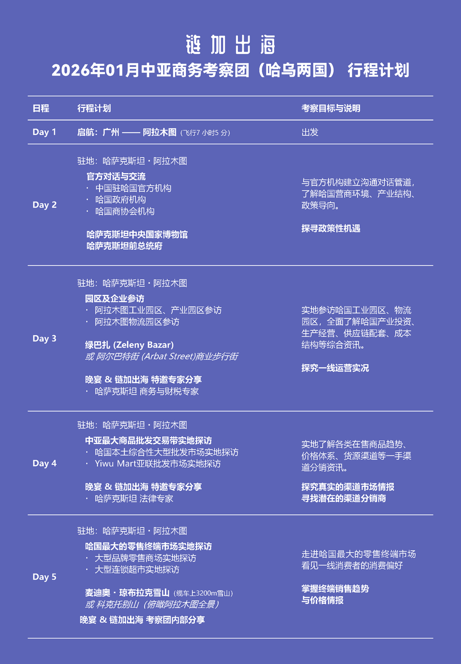 ——>2026年01月中亞商務(wù)考察團(tuán)招募公告(哈烏兩國深度) |