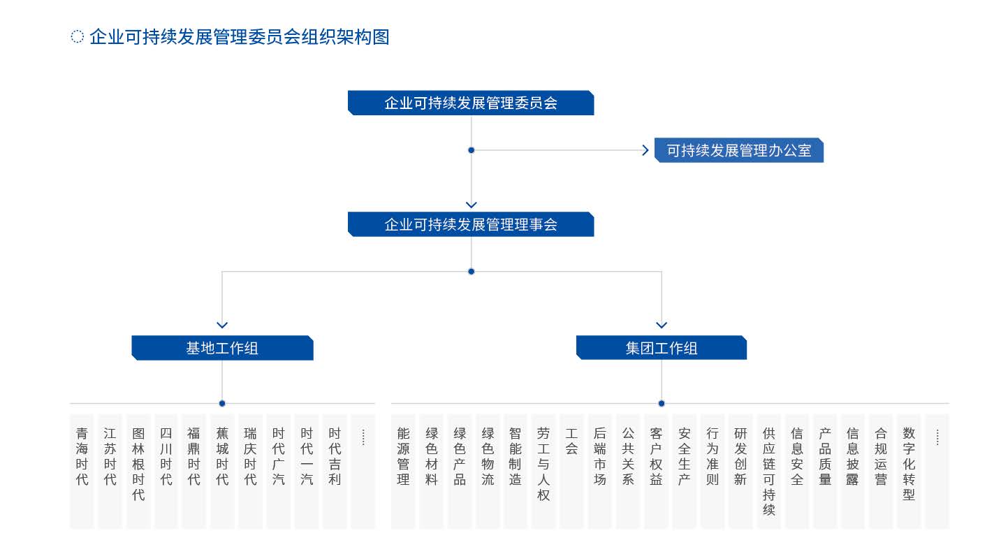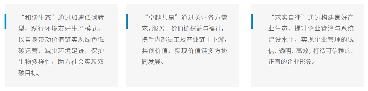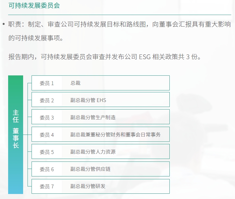 為深刻理解政策趨勢、全面滿足客戶要求、卓越履行社會責任,報告期內(nèi),公司優(yōu)化管理架構,構建可持續(xù)發(fā)展戰(zhàn)略委員會、可持續(xù)發(fā)展管理委員會,并下設專業(yè)項目小組和業(yè)務板塊可持續(xù)小組??沙掷m(xù)發(fā)展戰(zhàn)略委員會由董事長擔任委員會主席,由公司高管擔任委員,共同負責ESG發(fā)展戰(zhàn)略、政策,及整體工作方向,可持續(xù)發(fā)展管理委員會落實可持續(xù)發(fā)展戰(zhàn)略委員會決議,監(jiān)督推動工作小組以具體行動落實ESG事宜,此外開展內(nèi)部培訓、活動及宣傳以建立積極可持續(xù)的文化理念。