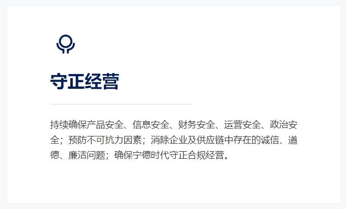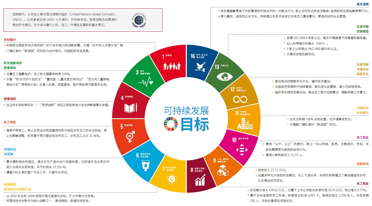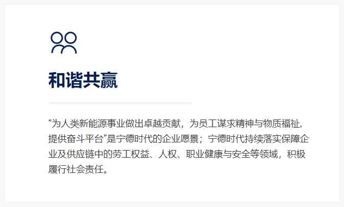 寧德時代積極響應聯(lián)合國可持續(xù)發(fā)展目標,在提供創(chuàng)新產(chǎn)品和服務的同時,將可持續(xù)發(fā)展管理理念融入到業(yè)務運營的方方面面,構建可持續(xù)發(fā)展管理體系,堅持道德經(jīng)營與合規(guī)經(jīng)營的原則,持續(xù)加強利益相關方的溝通,確保公司可持續(xù)發(fā)展,回饋客戶和社會。