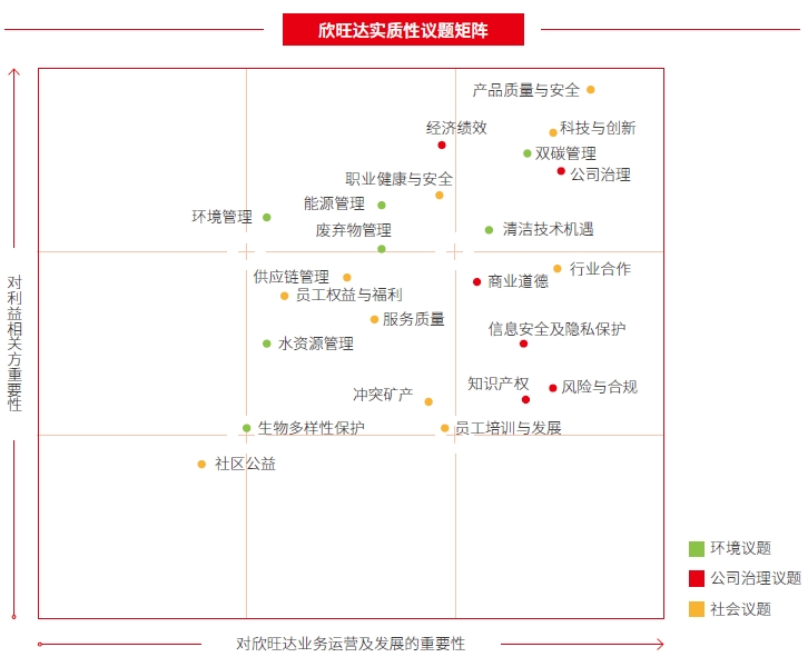為持續(xù)提升ESG管理水平,欣旺達依據(jù)國家宏觀政策導向、國內(nèi)外社會責任標準研究、利益相關方調(diào)研和公司發(fā)展戰(zhàn)略等維度,綜合識別出對公司和利益相關方均有重要影響的主題和議題,形成實質(zhì)性議題庫。欣旺達最新一次實質(zhì)性議題評估于2023年初完成,已識別的實質(zhì)性議題維持有效,并于本報告中持續(xù)回應相關議題行動與成效。
