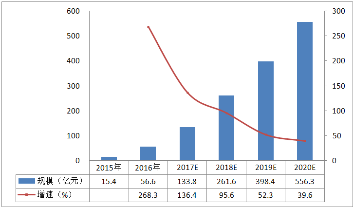2015年中國虛擬現(xiàn)實行業(yè)市場規(guī)模為15.4億元, 2016年達到56.6億元,2020年市場規(guī)模預(yù)計將超過550億元。