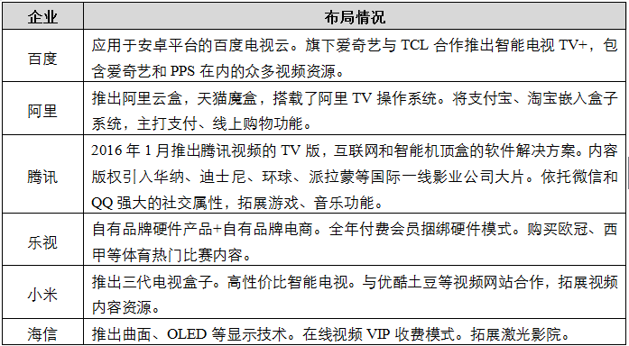 目前,智能電視領(lǐng)域主要的參與者有百度、阿里、騰訊、樂視、小米以及海信等企業(yè)。