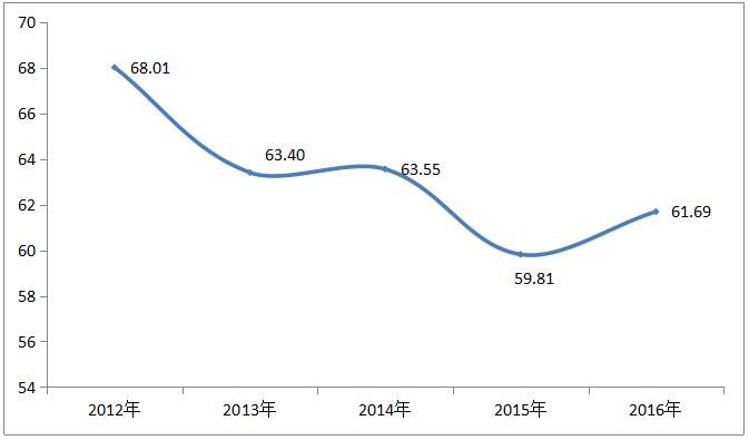 圖表1 2012-2016年中國鋼材實(shí)際消費(fèi)量占產(chǎn)量比重(單位:%