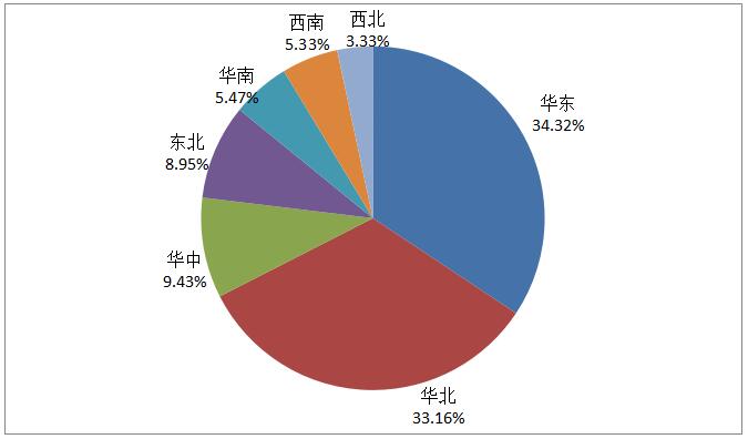 圖表2016年中國各區(qū)域粗鋼產(chǎn)量占比(單位:%