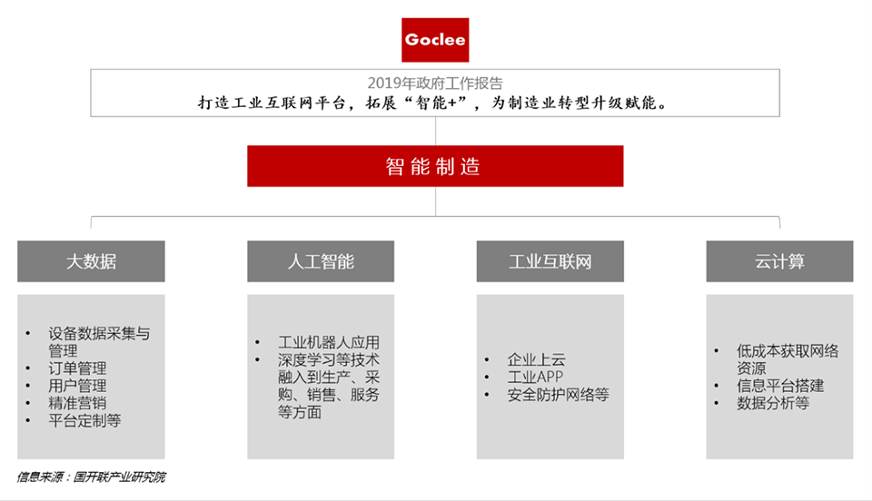 2019年政府工作報告中指出將圍繞推動制造業(yè)高質量發(fā)展,強化工業(yè)基礎和技術創(chuàng)新能力,促進先進制造業(yè)和現(xiàn)代服務業(yè)融合發(fā)展,加快建設制造強國。打造工業(yè)互聯(lián)網(wǎng)平臺,拓展“智能+”,為制造業(yè)轉型升級賦能。由此,“智能+”開始接棒“互聯(lián)網(wǎng)+”,成為國家推動傳統(tǒng)制造業(yè)升級轉型的新抓手,未來將成為政策關注的重點。