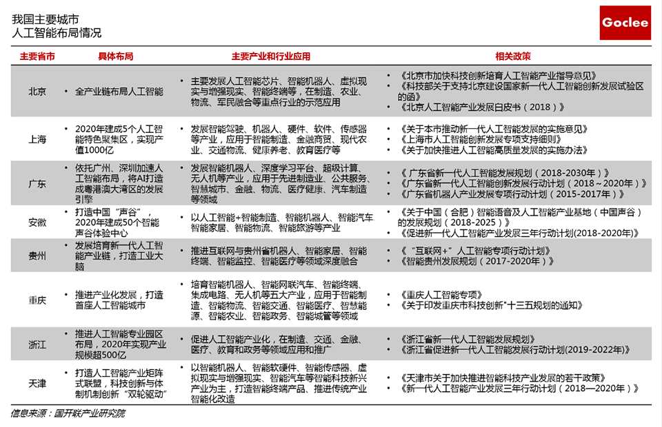由于大數(shù)據(jù)、云計算等技術在制造業(yè)企業(yè)進行智能轉型中較早應用,國內大部分城市已經開始對這兩項技術相關產業(yè)進行布局,幫助自身企業(yè)進行轉型。而對于人工智能、工業(yè)互聯(lián)網(wǎng)等人才基礎和產業(yè)水平要求較高的兩項技術,國內城市也開始逐步布局,北上廣深等一線城市依托龐大的人才基礎和產業(yè)優(yōu)勢率先布局,福建、貴州、天津、重慶等省市緊隨其后,通過相關平臺的搭建和技術水平的不斷提升,將人工智能和工業(yè)互聯(lián)網(wǎng)相關技術應用在醫(yī)療、高端裝備、汽車、安防、傳感器、3D打印、通航、智慧城市等產業(yè)和領域。