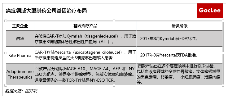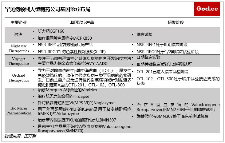 當(dāng)前越來越多的大型制藥公司正在通過并購、或與基因療法藥企深度合作的方式擴大或引入自身在基因治療的業(yè)務(wù)板塊,罕見病、癌癥成為基因治療的重要應(yīng)用領(lǐng)域,未來應(yīng)用前景廣闊。在罕見病應(yīng)用領(lǐng)域,諾華、Nightstar Therapeutics針對視網(wǎng)膜病變等研發(fā)出新產(chǎn)品,目前正處于臨床試驗階段;Voyager Therapeutics專注于神經(jīng)系統(tǒng)疾病研發(fā)出新療法;Orchard Therapeutics、BioMarin Pharmaceutical等聚焦于血液病和遺傳性代謝??;在癌癥應(yīng)用領(lǐng)域,諾華、Kite Pharma、Adaptimmune Therapeutics等致力于血液瘤和實體瘤等應(yīng)用領(lǐng)域取得基因療法新突破。