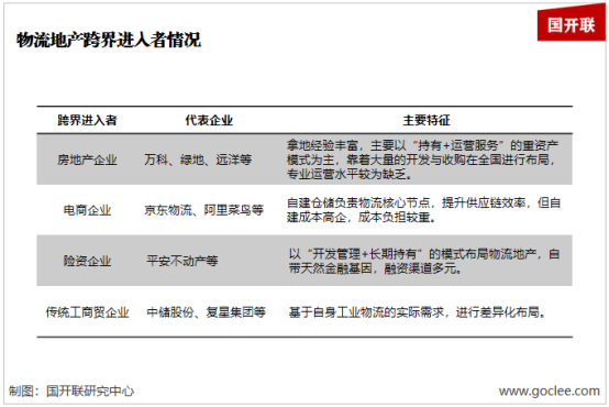 得益于良好的市場前景和可觀的投資回報率,當(dāng)前除去以普洛斯、豐樹、宇培、寶灣為代表的傳統(tǒng)物流地產(chǎn)商,以ESR(易商紅木)為代表的新興勢力崛起,也有各行業(yè)企業(yè)跨界進(jìn)場,以房地產(chǎn)開發(fā)商、電商企業(yè)、險資企業(yè)與財(cái)團(tuán)、傳統(tǒng)工商貿(mào)企業(yè)四類代表為主,其中不乏萬科、平安不動產(chǎn)、京東、菜鳥等行業(yè)巨頭。