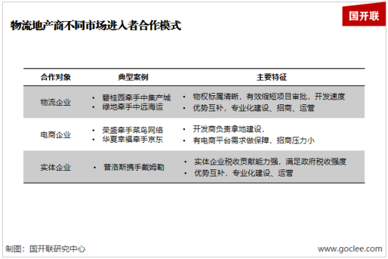 為規(guī)避給與政府純粹的物流地產(chǎn)印象,物流地產(chǎn)商各大進(jìn)入者攜手合作,以政府的利益訴求為切入點(diǎn),組成聯(lián)合體,其他企業(yè)以物流配套服務(wù)商出現(xiàn),既能滿足政府對稅收的期待,同時也能有效使用物流地產(chǎn)商提供的服務(wù),以此順利拿地。目前物流地產(chǎn)商已開始與物流企業(yè)、電商企業(yè)、實(shí)體企業(yè)合作,踐行這種模式。