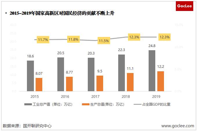 國(guó)家開(kāi)發(fā)區(qū)自1988年啟動(dòng)建設(shè)以來(lái),已經(jīng)成為我國(guó)實(shí)施創(chuàng)新驅(qū)動(dòng)戰(zhàn)略的主要載體,在轉(zhuǎn)變發(fā)展方式、優(yōu)化產(chǎn)業(yè)結(jié)構(gòu)、增強(qiáng)國(guó)際競(jìng)爭(zhēng)力等方面發(fā)揮了重要作用。根據(jù)國(guó)家科學(xué)技術(shù)部,2019年全國(guó)169個(gè)國(guó)家高新區(qū)總體營(yíng)收達(dá)38.3萬(wàn)億元,工業(yè)增加值達(dá)24.8萬(wàn)億元,園區(qū)生產(chǎn)總值達(dá)12.2萬(wàn)億,相較2015年增長(zhǎng)了51.2%,占我國(guó)GDP的比重從2015年的11.7%上升至2019年的12.3%,增長(zhǎng)了0.6個(gè)百分點(diǎn),對(duì)我國(guó)國(guó)民經(jīng)濟(jì)的貢獻(xiàn)不斷上升。