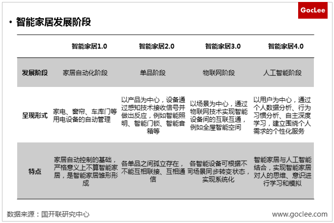 智能家居是以住宅為平臺,基于物聯(lián)網(wǎng)技術(shù)、軟件系統(tǒng)、云計算平臺構(gòu)成的家居生態(tài)圈,并通過數(shù)據(jù)收集,分析用戶行為數(shù)據(jù)為用戶提供個性化服務(wù)。智能家居的發(fā)展可分為四個階段,分別是家居自動化階段、智能家居單品階段、物聯(lián)網(wǎng)階段、人工智能階段。