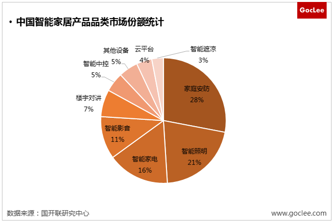 我國智能家居產(chǎn)品較為集中,目前主要以家庭安防、智能照明和智能家電為主,這三類產(chǎn)品在智能家居產(chǎn)品品類市場份額當(dāng)中占比合計達(dá)65%。其中,家庭安防的市場份額占比最高,達(dá)到28%,是智能家居中的重要一環(huán),主要包括智能攝像頭、智能貓眼、智能門鎖、智能空氣檢測儀等。智能照明占據(jù)21%市場份額,其中90%是智能照明系統(tǒng),燈具和相關(guān)配飾僅占10%。智能家電占據(jù)16%的市場份額,主要以智能空調(diào)、智能冰箱和智能洗衣機為主,三者占智能家電的比重達(dá)70%。而受到價格低、能滿足消費者即時需求的影響,智能音響產(chǎn)品的市場增速較快。除了它本身便捷的使用體驗,更在于其將是未來家庭生活物聯(lián)網(wǎng)的入口,連接著萬億級別的家庭消費市場。
