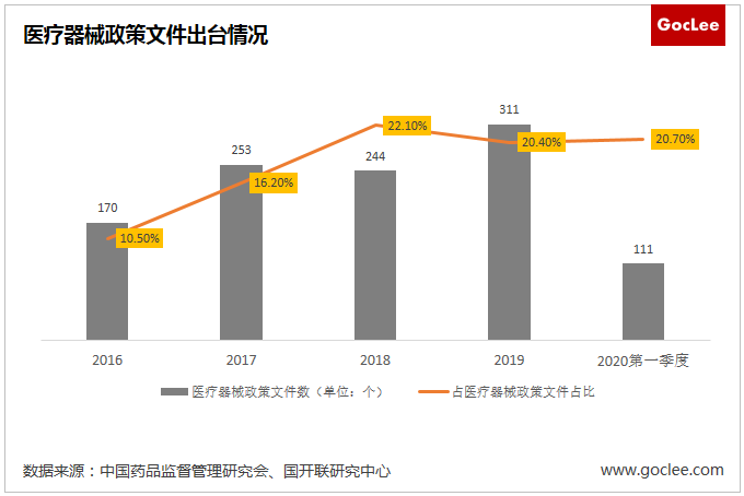 國(guó)家對(duì)醫(yī)療器械行業(yè)愈發(fā)重視。從國(guó)家和地方出臺(tái)的醫(yī)藥行業(yè)政策文件來(lái)看,2016年、2017年、2018年、2019年出臺(tái)的醫(yī)療政策文件數(shù)分別是170個(gè)、253個(gè)、244個(gè)、311個(gè),在醫(yī)藥行業(yè)政策文件占比分別是10.5%16.2%、22.1%、20.4%。其中,2020年僅第一季度就出臺(tái)醫(yī)療器械政策文件111個(gè),占比20.7%,體現(xiàn)國(guó)家對(duì)醫(yī)療器械行業(yè)的高度重視。