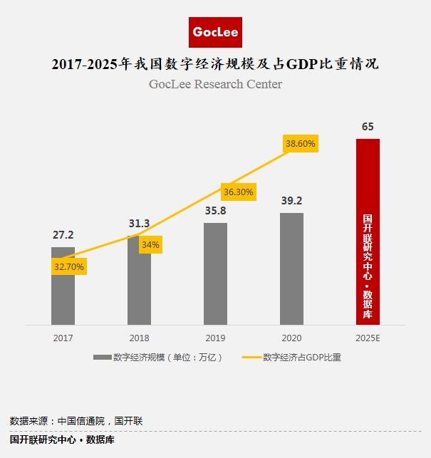 近年來(lái),我國(guó)深入實(shí)施數(shù)字經(jīng)濟(jì)發(fā)展戰(zhàn)略,數(shù)字經(jīng)濟(jì)蓬勃發(fā)展,2020年中國(guó)數(shù)字經(jīng)濟(jì)規(guī)模達(dá)到39.2萬(wàn)億元,占GDP比重為38.6%,預(yù)計(jì)到2025年我國(guó)數(shù)字經(jīng)濟(jì)規(guī)??蛇_(dá)到65萬(wàn)億,新技術(shù)、新業(yè)態(tài)、新模式加速滲透到經(jīng)濟(jì)社會(huì)各領(lǐng)域。