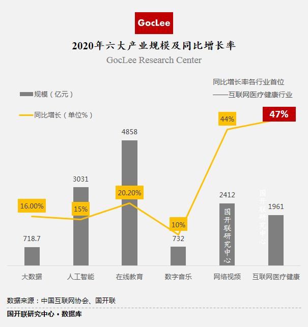 2020年,我國(guó)云計(jì)算整體市場(chǎng)規(guī)模達(dá)到1781.8億元,增速為33.6%,市場(chǎng)規(guī)模增速明顯;智能網(wǎng)聯(lián)汽車銷量為303.2萬(wàn)輛,同比增長(zhǎng)107%,滲透率保持在15%左右;網(wǎng)絡(luò)視頻市場(chǎng)規(guī)模達(dá)到2412億元,同比增長(zhǎng)44%,數(shù)字音樂(lè)產(chǎn)業(yè)市場(chǎng)規(guī)模達(dá)732億元,同比增長(zhǎng)10%;在線教育市場(chǎng)規(guī)模繼續(xù)保持穩(wěn)定增長(zhǎng),達(dá)到4858億元,同比增長(zhǎng)20.2%;互聯(lián)網(wǎng)醫(yī)療市場(chǎng)增速迅猛,規(guī)模達(dá)到1961億元,同比增長(zhǎng)47%,增幅位居各行業(yè)首位。