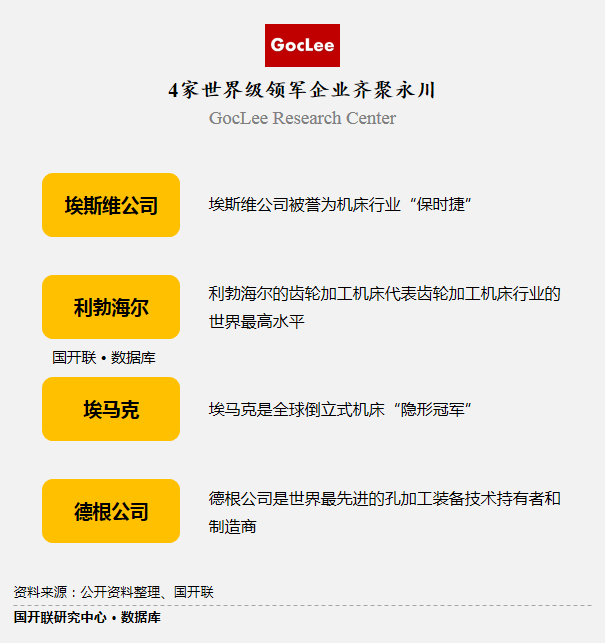 4家業(yè)內(nèi)高端數(shù)控機(jī)床世界級(jí)領(lǐng)軍企業(yè)聚永川。其中,埃斯維公司被譽(yù)為機(jī)床行業(yè)“保時(shí)捷”,利勃海爾的齒輪加工機(jī)床代表齒輪加工機(jī)床行業(yè)的世界最高水平,埃馬克是全球倒立式機(jī)床“隱形冠軍”,德根公司是世界最先進(jìn)的孔加工裝備技術(shù)持有者和制造商。它們的相繼建成投產(chǎn),為永川數(shù)控機(jī)床及智能裝備產(chǎn)業(yè)的快速發(fā)展提供強(qiáng)勁動(dòng)力。