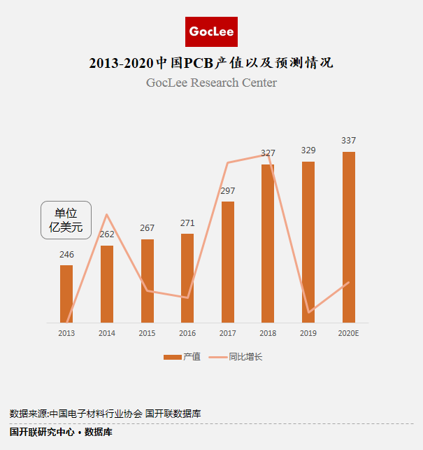 這些年來,國內(nèi)的PCB產(chǎn)值不斷壯大,2013年整個(gè)PCB產(chǎn)值僅為246億美元,但是到了2019年,我國的PCB產(chǎn)值已經(jīng)上漲了329,整體增幅達(dá)到了33.73%,增長十分迅速。