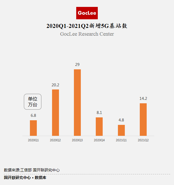 在國家政策的大力支持下,我國5G技術(shù)的研發(fā)以及建設(shè)在全球范圍內(nèi)都是處于領(lǐng)先地位的,基站的建設(shè)也是如火如荼。2020Q1、Q2、Q3、Q4新增基站數(shù)6.8萬臺(tái)、20.2萬臺(tái)、29.0萬臺(tái)、8.1萬臺(tái),今年Q1、Q2分別新增4.8萬臺(tái)、14.2萬臺(tái)。