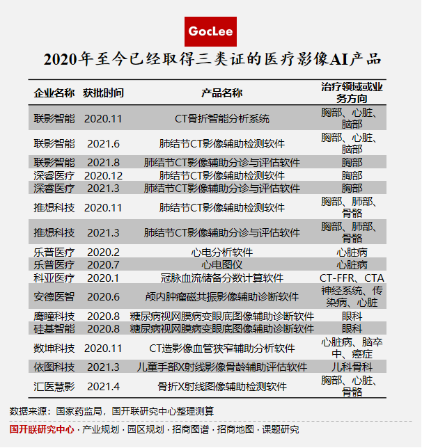 《國(guó)開(kāi)聯(lián) -第三方醫(yī)學(xué)影像中心行業(yè)報(bào)告2021》數(shù)據(jù)顯示,2020年前尚無(wú)醫(yī)學(xué)影像AI產(chǎn)品取得三類證,但是從2020年至今,已有11家企業(yè)的16款醫(yī)學(xué)影像AI產(chǎn)品取得三類證,其中不少產(chǎn)品的應(yīng)用治療領(lǐng)域開(kāi)始從肺結(jié)節(jié)和糖網(wǎng)病變向心腦血管、神經(jīng)系統(tǒng)、骨骼甚至腫瘤等多個(gè)病種滲透,標(biāo)志著醫(yī)療影像AI產(chǎn)品開(kāi)始多元化: