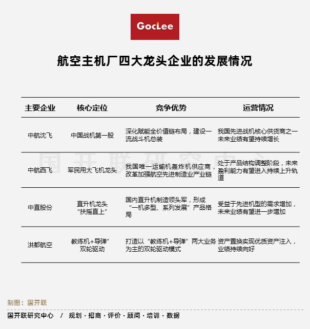 作為航空裝備產(chǎn)業(yè)鏈最核心的下游,四大主機廠龍頭企業(yè)將繼續(xù)引領(lǐng)產(chǎn)業(yè)鏈成長的強勁力量,隨著中央扶持加大,四大平臺也將成為國內(nèi)航空裝備的重要支撐,保障國防安全,同時也引領(lǐng)航空設(shè)備制造業(yè)提質(zhì)升級,實現(xiàn)高質(zhì)量可持續(xù)發(fā)展,發(fā)揮航空裝備主航向作用。