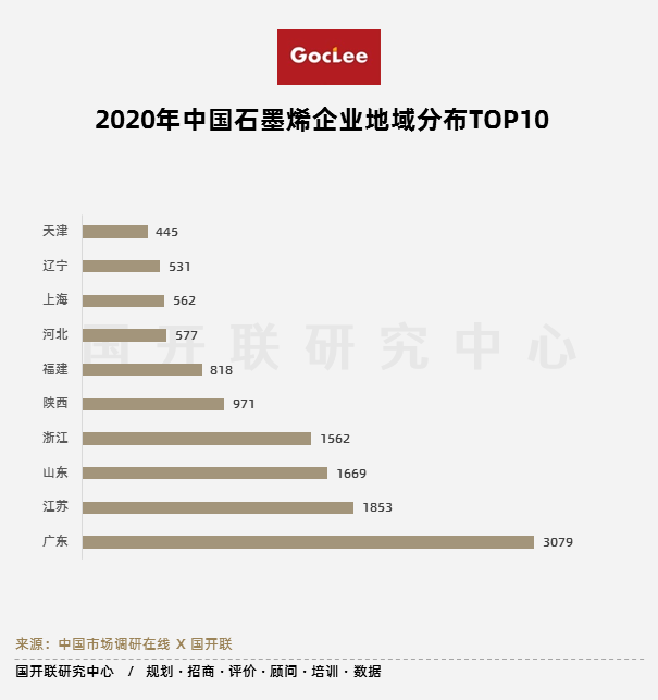 我國東南沿海地區(qū)由于優(yōu)越的地理位置、雄厚的經(jīng)濟實力以及便利的交通條件,石墨烯產(chǎn)業(yè)發(fā)展較為成熟,同時也涌現(xiàn)出一批具有規(guī)模效應(yīng)的石墨烯企業(yè),其中廣東、江蘇、山東石墨烯產(chǎn)業(yè)區(qū)域較為突出。據(jù)不完全統(tǒng)計,2020年廣東石墨烯相關(guān)企業(yè)已超過3000家,數(shù)量全國第一;江蘇作為我國石墨烯產(chǎn)業(yè)的發(fā)源地,相關(guān)企業(yè)超過1800多家,;山東石墨烯產(chǎn)業(yè)企業(yè)數(shù)量排名第三,約1669家。