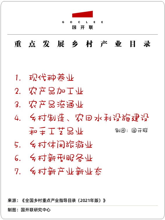 根據(jù)《全國(guó)鄉(xiāng)村重點(diǎn)產(chǎn)業(yè)指導(dǎo)目錄(2021年版)》,我國(guó)重點(diǎn)鄉(xiāng)村產(chǎn)業(yè)主要分為七大類(lèi),主要涵蓋:現(xiàn)代種養(yǎng)業(yè)、農(nóng)產(chǎn)品加工業(yè)、農(nóng)產(chǎn)品流通業(yè)、鄉(xiāng)村制造、農(nóng)田水利設(shè)施建設(shè)和手工藝品業(yè)、鄉(xiāng)村休閑旅游業(yè)、鄉(xiāng)村新型服務(wù)業(yè)和鄉(xiāng)村新產(chǎn)業(yè)新業(yè)態(tài)。