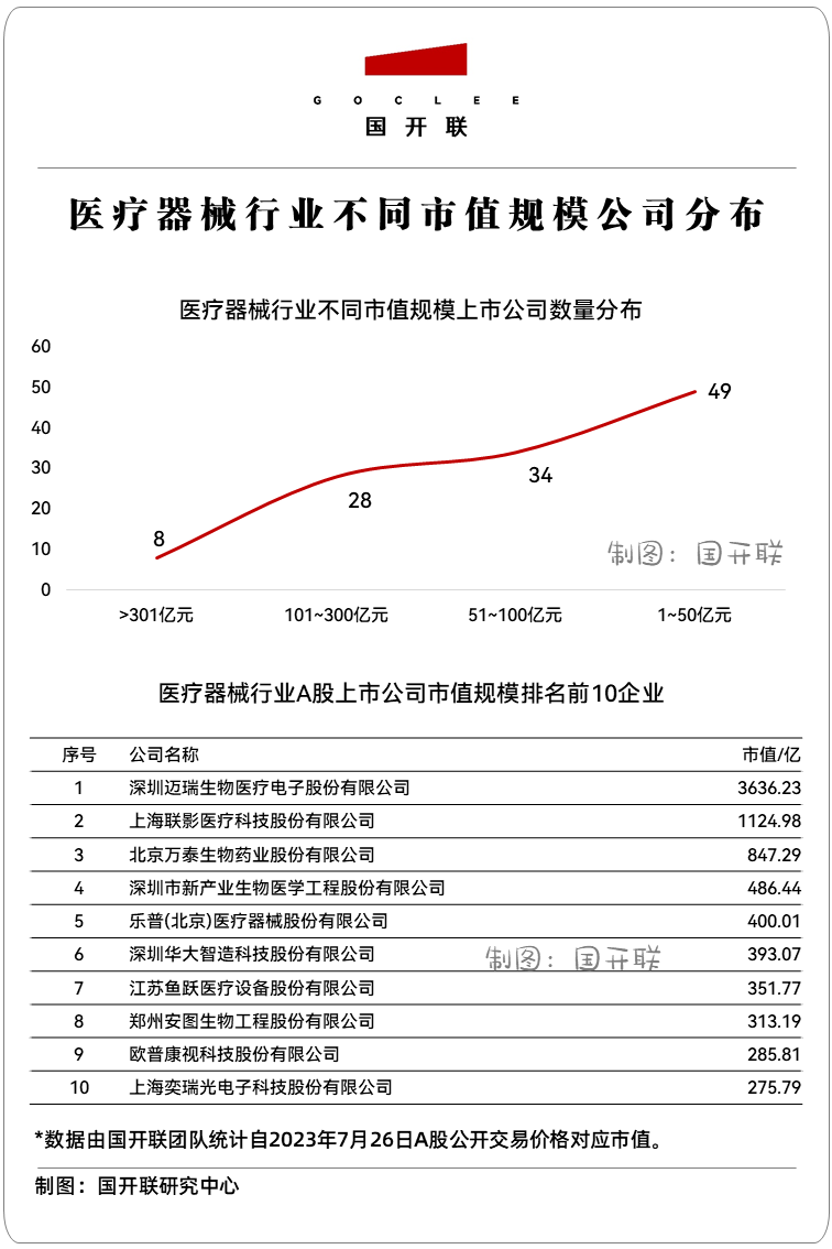 從醫(yī)療器械行業(yè)上市公司的市值規(guī)模來看,除了邁瑞醫(yī)療擁有超過3600億的市值規(guī)模、聯(lián)影醫(yī)療擁有超過1100億的市值規(guī)模,其他都在千億規(guī)模以下,且都集中于百億規(guī)模以內(nèi)。