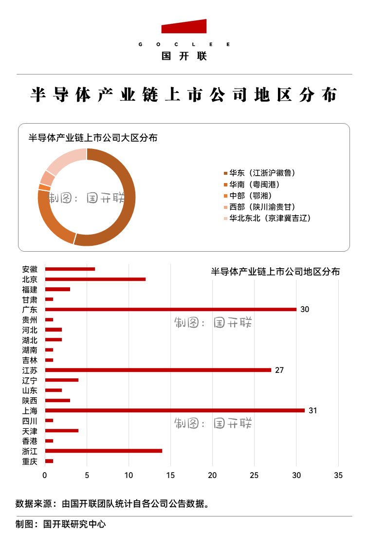 從企業(yè)分布來看,上海、廣東和江蘇是我國半導(dǎo)體產(chǎn)業(yè)鏈最主要的集中地,三地半導(dǎo)體產(chǎn)業(yè)鏈上市公司數(shù)分別高達(dá)31家、30家和27家。從大區(qū)域分布來看,華東地區(qū)擁有絕對的優(yōu)勢,中部地區(qū)集中度相對偏低,以陜西為代表的西部地區(qū)半導(dǎo)體產(chǎn)業(yè)鏈上市公司數(shù)達(dá)7家。